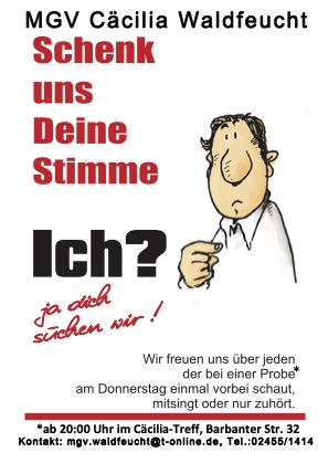 Der Chor probt jeden Donnerstag ab 20.00 Uhr im Cäciliatreff, Waldfeucht Brabanterstr. 32. Die Waldfeuchter Sänger freuen sich über jeden, der bei einer Probe einmal vorbeischaut, mitsingt oder nur zuhört. Waldfeucht im Oktober 2024
