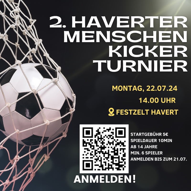 Der Montag beginnt um 09.45 Uhr mit einem geistlichen Impuls im Festzelt. Anschließend wird bei der Kranzniederlegung der verstorbenen Schützenbrüder gedacht. Der Vormittag wird mit einem Frühschoppen im Festzelt fortgesetzt. Ab 14 Uhr findet das zweite Haverter Menschenkicker-Turnier statt, das an den großen Erfolg des letzten Jahres anknüpft und spannende Unterhaltung verspricht.