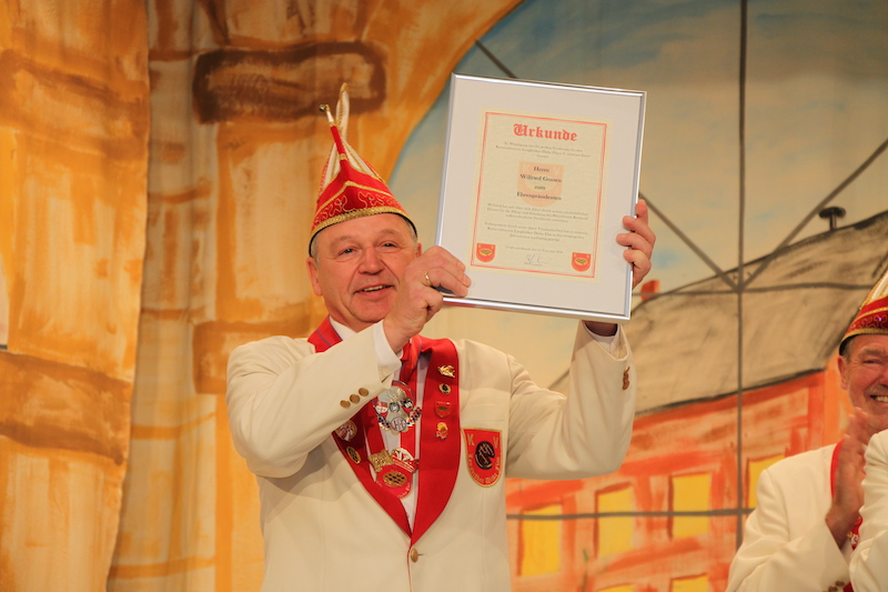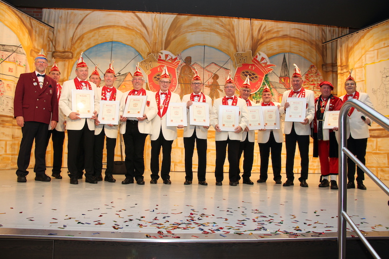 Der VKAG ehrte 7 Mitglieder der Dicken Flaa. Jens Fleischer, Detlef Käding, Hubert Heutz und Hans Peter Derichs wurde jeweils der silberne Verbandsorden verliehen. Karl Heinz Nießen, Franz Josef Ronkartz und Wilfried Gossen erhielten den Verbandsorden in Gold vom Vertreter des VKAG, Roland Turtschan. Der Verein selbst ernannte 9 verdiente Mitglieder zu Ehrenmitgliedern, da sie sich seit vielen Jahren für den Verein in großem Umfang engagieren und die Geschichte der Dicke Flaa somit allesamt prägten. Wilfried Gossen wurde danach von Präsident Stefan Keulen als Ehrenpräsident ernannt. Diese Auszeichnung wurde mit stehenden Ovationen seitens des Publikums und der anderen Vereinsmitglieder gefeiert und der neu ernannte Ehrenpräsident war sichtlich gerührt von dieser Auszeichnung, die er sich durch jahrzehntelange Vorstandsarbeit und unermüdlichen Einsatz für die Langbröker Dicke Flaa redlich verdient hat. Die Dorfspatzen sorgten mit ihren Liedern für stimmungsvolle musikalische Einlagen und wurden dabei von Karl Schöbben am Dudelsack unterstützt – ein besonderer Genuss für die Zuhörer.