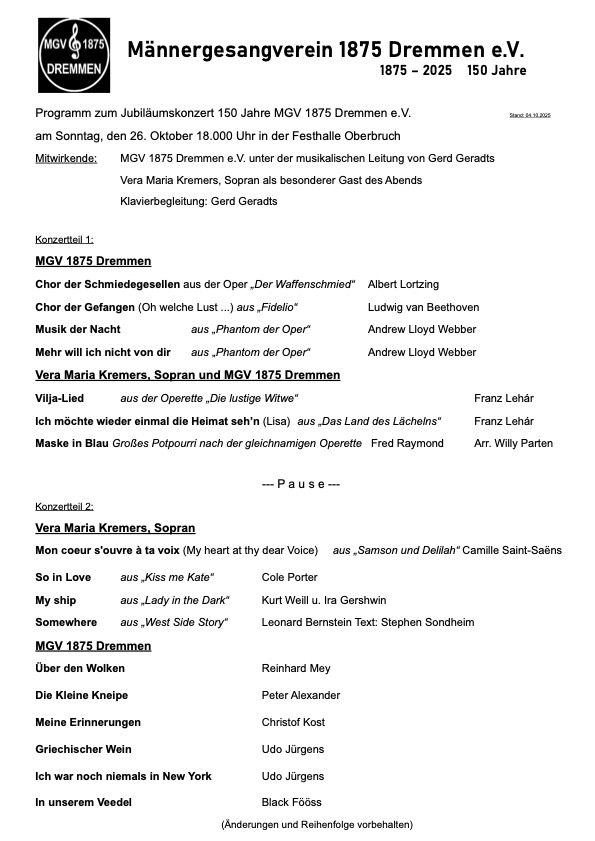 Programm zum Jubiläumskonzert 150 Jahre MGV 1875 Dremmen e.V.