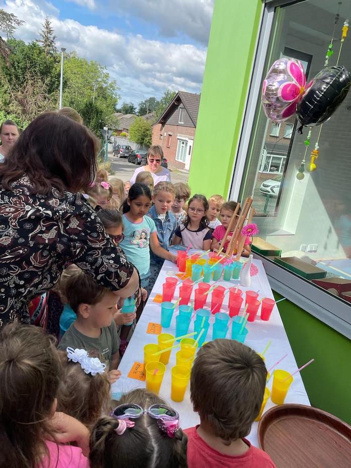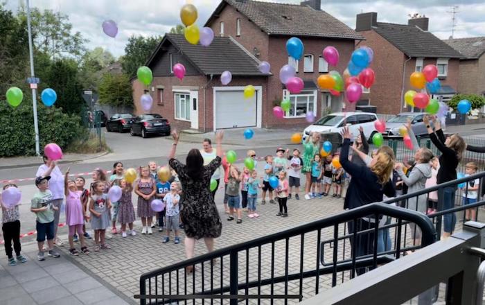 Und das sollte auch gebührend gefeiert werden. Und womit hätte man besser feiern können als mit den Akteuren selbst?! Hierfür hatte sich das Team der Einrichtung etwas ganz besonderes überlegt. Mit alkoholfreiem Sekt, Kaffee und Orangensaft wurden die Eltern während der morgendlichen Bringphase zum Mitfeiern eingeladen, was auf große Resonanz stieß. Auch an die Eltern, die sich bereits auf direktem Weg zur Arbeit befanden, war gedacht worden und so wurden auch „Coffee to go“-Becher angeboten. Ein wenig später durften sich dann auch die Kinder überraschen lassen. Auf sie warteten ein Fruchtgetränk sowie ein mit Helium gefüllter Luftballon, den alle Kinder gleichzeitig in den Himmel schickten. Gespannt verfolgten die Kinder die soeben aufgestiegenen Luftballons noch eine ganze Weile. Außerdem sangen die Kinder und Mitarbeiterinnen ein Lied, in dem sie Gott für ihren schönen Kindergarten dankten. Zum Abschluss der Feierlichkeiten wurde noch ein Schild angebracht, durch welches ersichtlich wird, dass der Kath. Sprachkindergarten „Rappelkiste“ Tüddern mit dem KTK-Qualitätsbrief ausgezeichnet wurde.