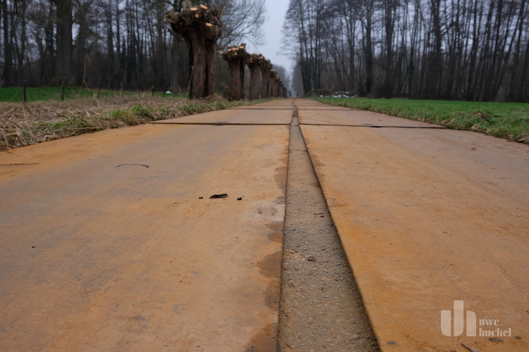 Dicke Stahlplatten schützen den Radweg vor Beschädigungen. Ende Februar sollen die Arbeiten abgeschlossen sein, dann kann sich die Natur wieder zurück holen, was ihr der Mensch genommen hat.