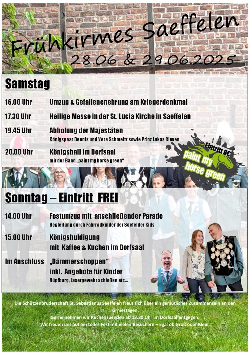 SAEFFELEN: Die Frühkirmes in Saeffelen steht vor der Tür! Am 28. und 29. Juni wird im und rund um das Dorfzentrum wieder groß gefeiert. Das Königspaar Dennis und Vera Schmeitz sowie ihre Familie freuen sich darauf, mit den Dorfbewohnern gemeinsam ein unvergessliches Fest zu erleben. Auch Lukas Cleven, der in diesem Jahr zum dritten Mal in Folge die Prinzenwürde erringen konnte, erwartet die Feierlichkeiten voller Vorfreude.
