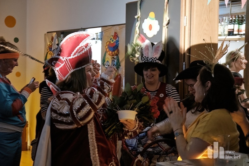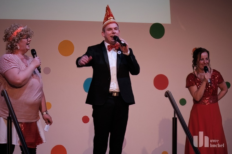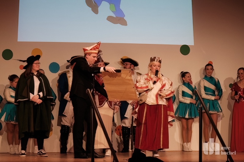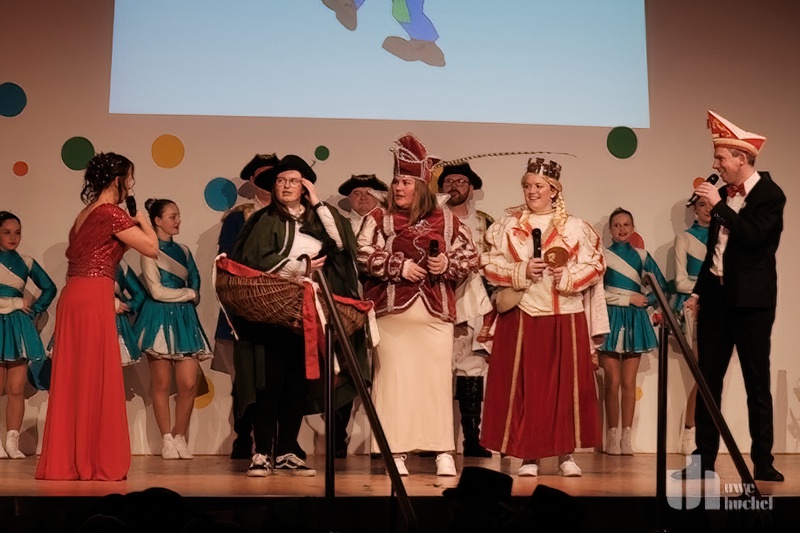 Dann stand eine Überraschung auf dem Programm. Es wurde ein gut gehütetes Geheimnis gelüftet. Unter tosendem Beifall zog Saeffelens weibliches Dreigestirn auf die Bühne. Bäuerin Annika (Griens), Jungfrau Judith (Killen) und Prinzession Lena (Cleven) haben das Zepter in dieser Session übernommen und verkündeten Ihre karnevalistischen Gesetze.