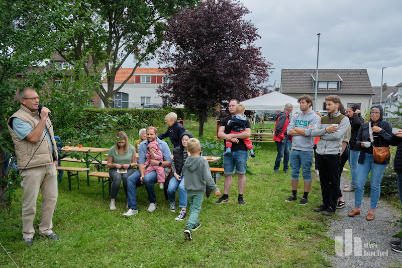 Am Samstagnachmittag wurde der Dorfgarten in Saeffelen erfolgreich eröffnet. Die durch Ortsvorsteher Werner Joerißen initiierte Interessengemeinschaft "Klima, Natur und Umwelt Saeffelen" konnte auf einem privaten Grundstück eine grüne Oase mitten im Ort neben dem Spielplatz verwirklichen: Zwei Hochbeete aus Trockenmauern, Obstbäume und -Sträucher, ein Gemüsebeet und Wege wurden neu angelegt, eine Blumenwiese mit regionalem Saatgut eingesät und eine artenreiche Hecke gepflanzt. Das Gemüse und Obst steht der ganzen Dorfbevölkerung kostenlos zur Verfügung und darf gerne (gegen ein bisschen Gießen oder Unkraut zupfen) geernet werden! Die Initiatoren bedanken sich bei Gülsen Litherland vom Quartiersmanagment und Bürgermeister Norbert Reyans für die Unterstützung aus Fördergeldern, sowie Herrn Herbert Ohlenforst, der stellvertretend für seinen verstorbenen Bruder Erwin der Eröffnung beiwohnte und das Grundstück weiterhin zur Verfügung stellt. Für die kommenden Jahre sind weitere Ideen für den Dorfgarten in Planung; bald wird eine Infotafel am Garten über anstehende Aktionen, Erntezeiten und Kontaktdaten informieren!