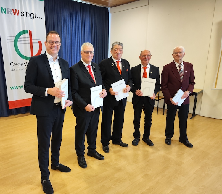Mit einem Ehrenzeichen in Gold samt Urkunde ehrte der Deutsche Chorverband die Herrn Jakob Hochhausen vom MGV 1875 Dremmen; Leo Jentgens, Quartettverein 1927 Myhl e.V. Werner Gibbels, Übacher Gesangverein 1848 sowie Karl-Josef Jansen des MGV Teveren – Plums Quartettverein 1917 e.V.