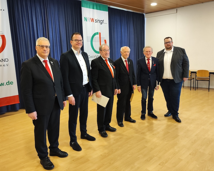 Frau Gisela Küppers vom Gesangverein „Frohsinn“ Beeck e.V.; Heinz-Willi Timmermanns des MGV „ST. Josef“ 1862 Kirchhoven e.V.; Hermann-Josef Brockers des MGV „Liederkranz“ Wegberg; Günter Klimek u. Dieter Weymann beide vom MGV „Eintracht“ Hückelhoven-Kleingladbach sowie Heinz-Gerd Kremers vom MGV Cäcilia Waldfeucht wurden anlässlich ihres 60-jährigen Jubiläums mit je einem goldenen Ehrenzeichen bedacht.