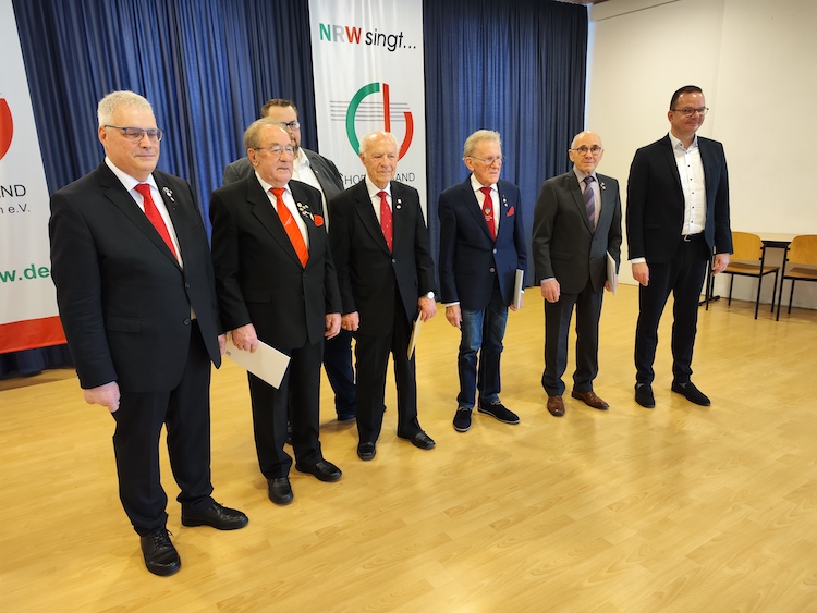 Ganz besonders ausgezeichnet wurden sieben Jubilare für 65 Jahre Singen im Chor. Eine goldene Plakette, eine goldene Ehrennadel sowie eine Urkunde wurden vom ChorVerband NRW verliehen an: Heinz Seferens, MGV „St. Josef“ Höngen e.V.; Franz Meeßen, MGV „ST. Josef“ 1862 Kirchhoven e.V.; Karl-Heinz Meyer, MGV „Liederkranz“ Wegberg; Hans Beulen u. Alfred Küppers, beide MGV Cäcilia Waldfeucht sowie Manfred Schaffrath u. Norbert Rexing vom Quartettverein 1927 Myhl e.V.