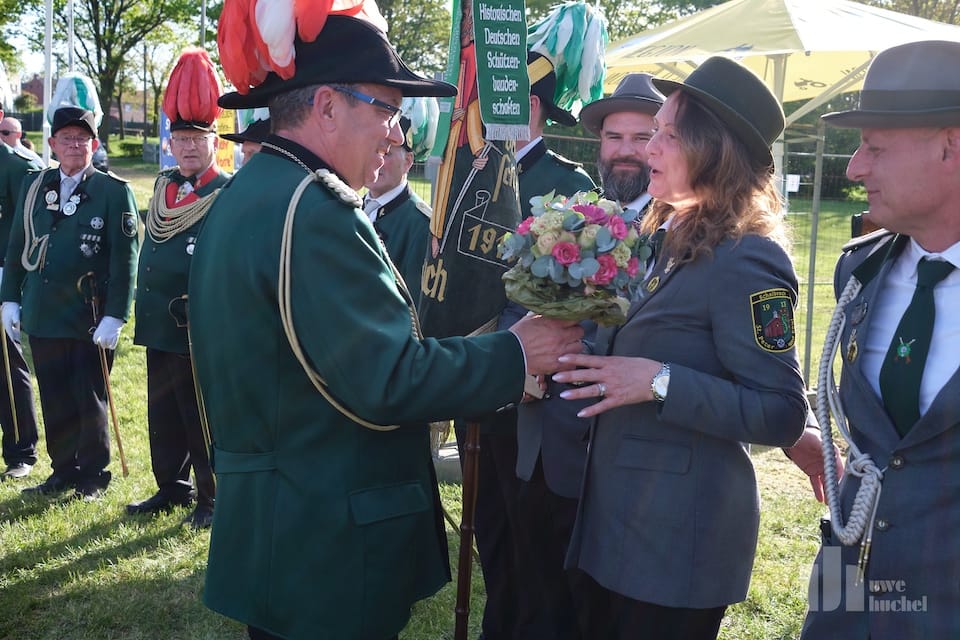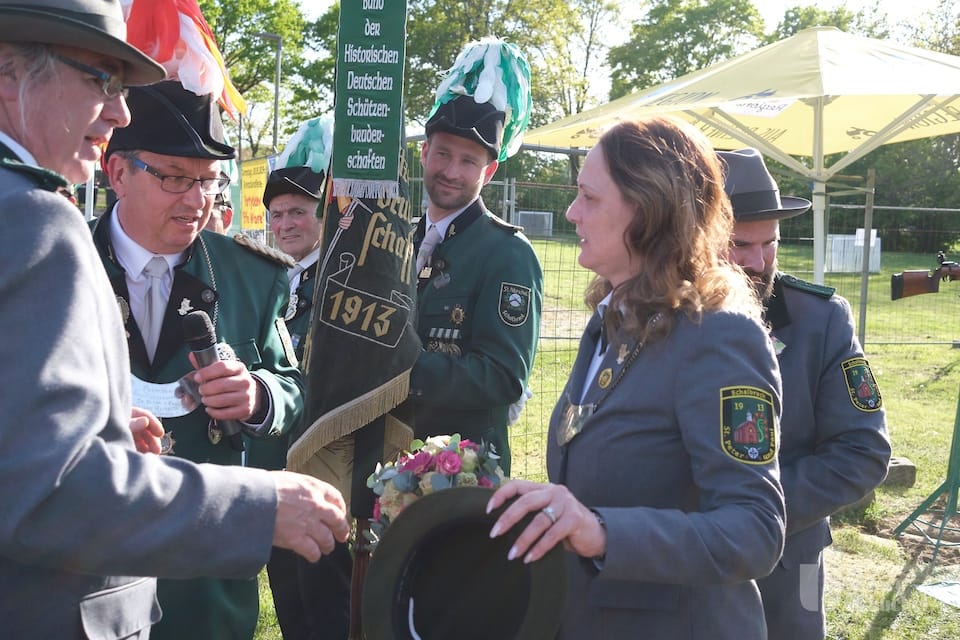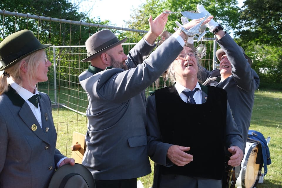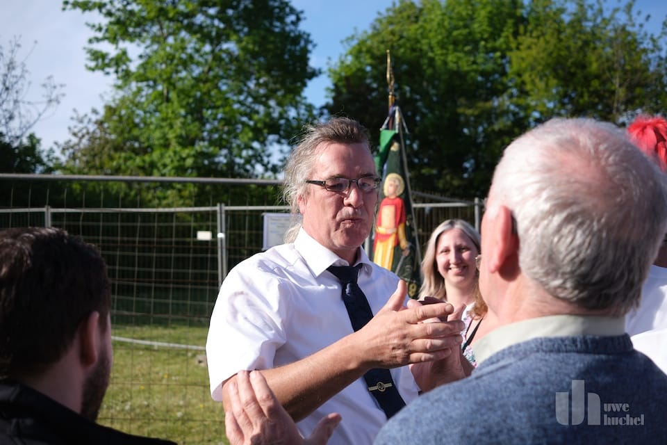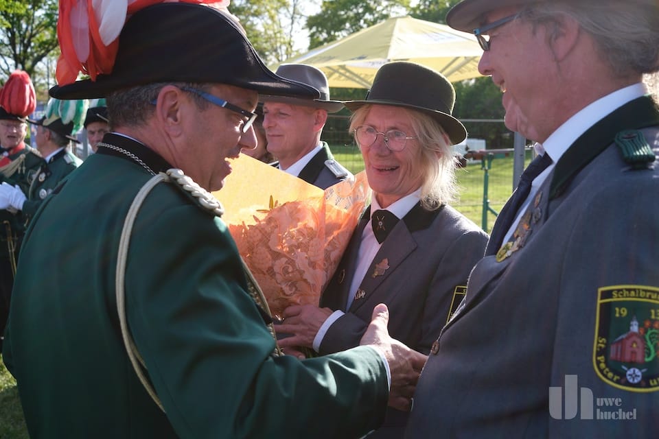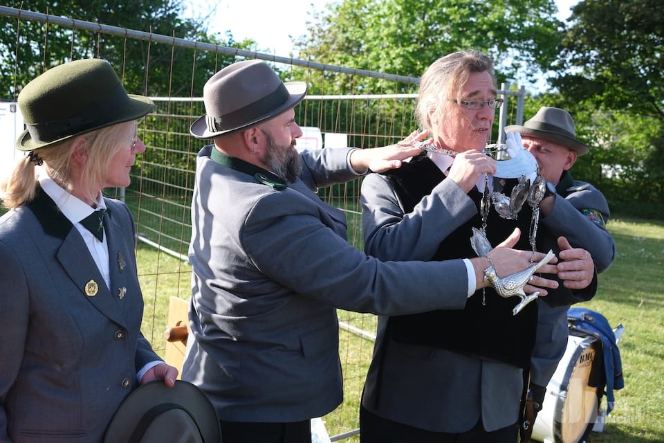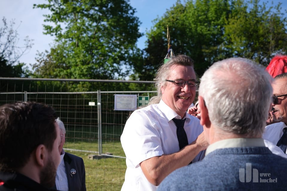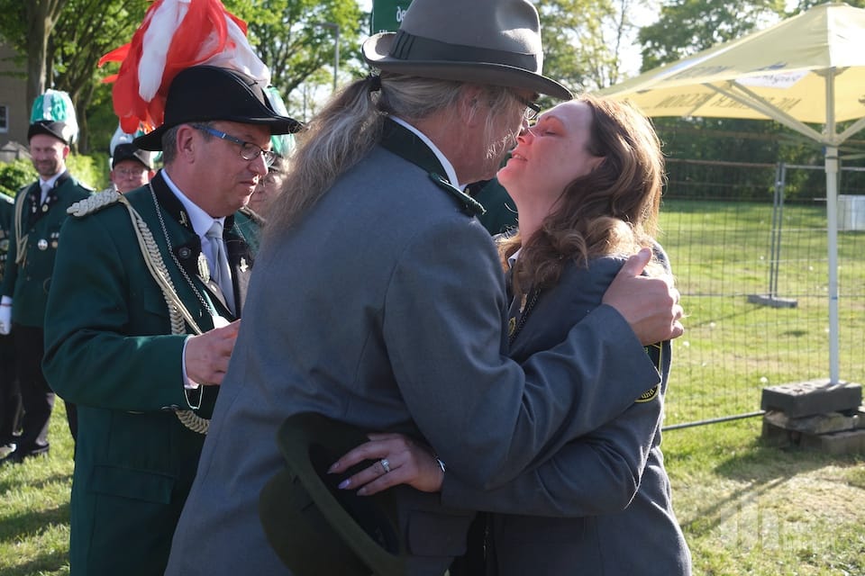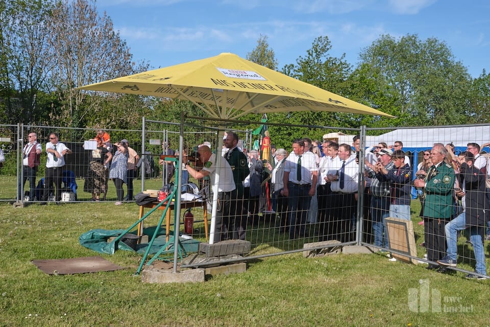 Spannender geht es kaum. Ein minimaler Rest des Vogels hing noch am Brett, aber da kennt man in Schalbruch nichts. Alles muß ab. Von der Position der Schützen kaum zu sehen, mußte der Schießmeister sich vor Ort überzeugen. Alles ab - Michael Scholz ist der neue Schützenkönig in Schalbruch und ab 2027 Kaiser. Bettina Winzer ist seine Kaiserin.