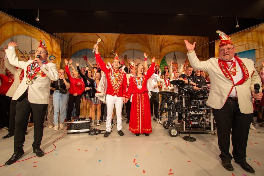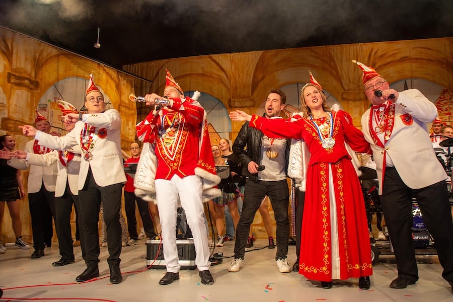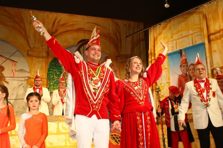 Die Kappensitzung am Samstag begann traditionell mit dem Einzug des Elferrats zum Vereinslied. Anschließend empfing das Publikum das einziehende Prinzenpaar mit tosendem Applaus. Prinz Robert I. (Robert Gossen) und Prinzessin Jasmin I. (Jasmin Gossen) richteten einige Worte an die begeisterten Gäste, bevor sie ihr Prinzenlied „För 1 Naach“ live performten.