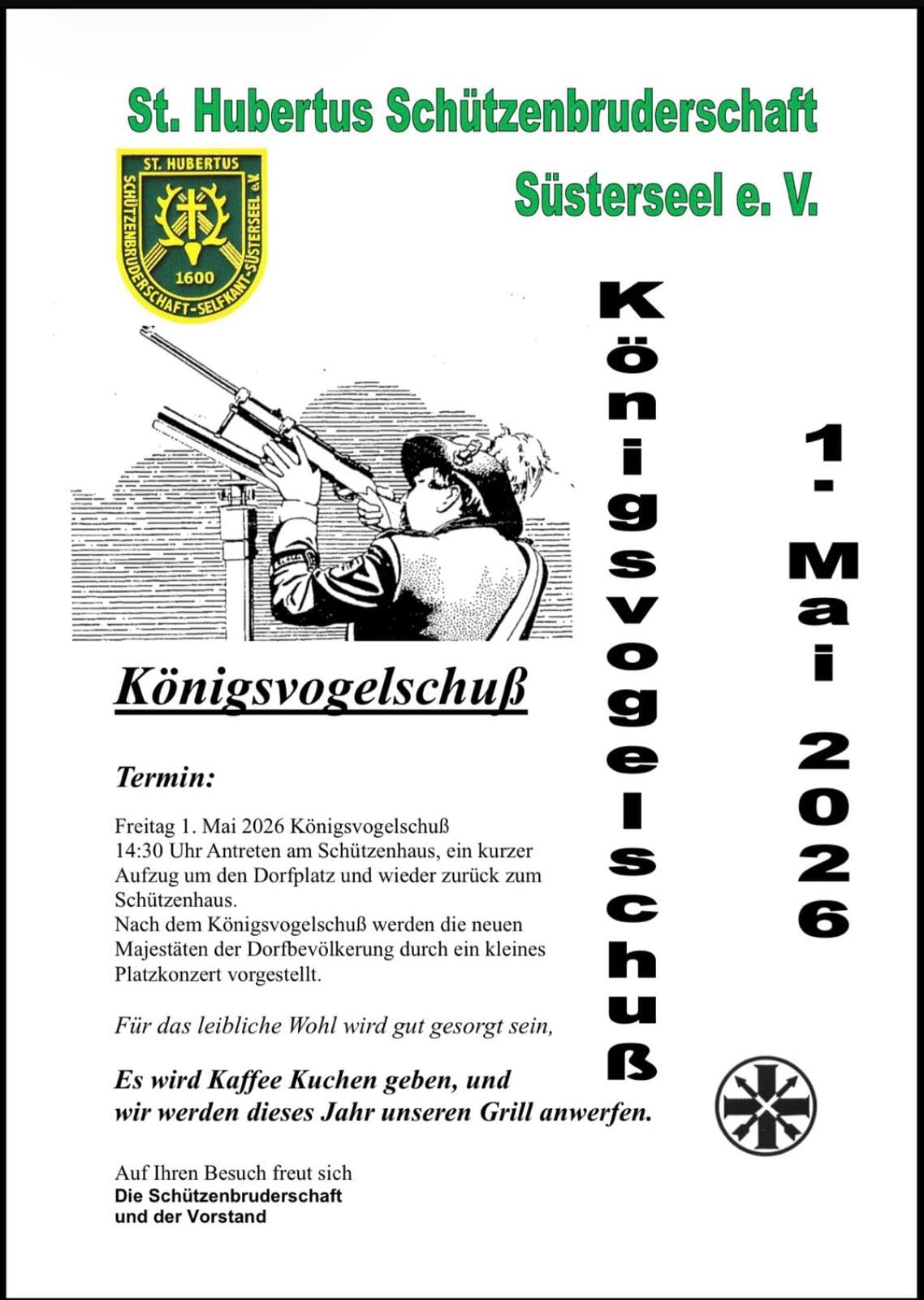 Tanz in den Mai und Vogelschuss Uwe Huchel | vor etwa 8 Stunden | 1 Min. Lesezeit Tanz in den Mai und Vogelschuss U Uwe Huchel | vor etwa 8 Stunden | 1 Min. Lesezeit Süsterseel 30.4. ab 19 Uhr Maibaumaufstellen 1.5. Königsvogelschuss Teilen: