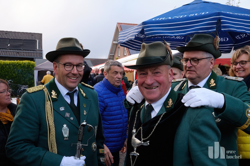 Bei den Schützen selbst dauerte es etwas länger. Der Vogel war in diesem Jahr aus einem ganz besonderen Holz und wollte einfach nicht fallen. Im Endkampf waren 5 Schützen. Dann fiel der Vogel endlich nach 266 Schüssen von der Stange und Theo Baumanns ein Stein vom Herzen - er ist der neue Schützenkönig in Tüddern.