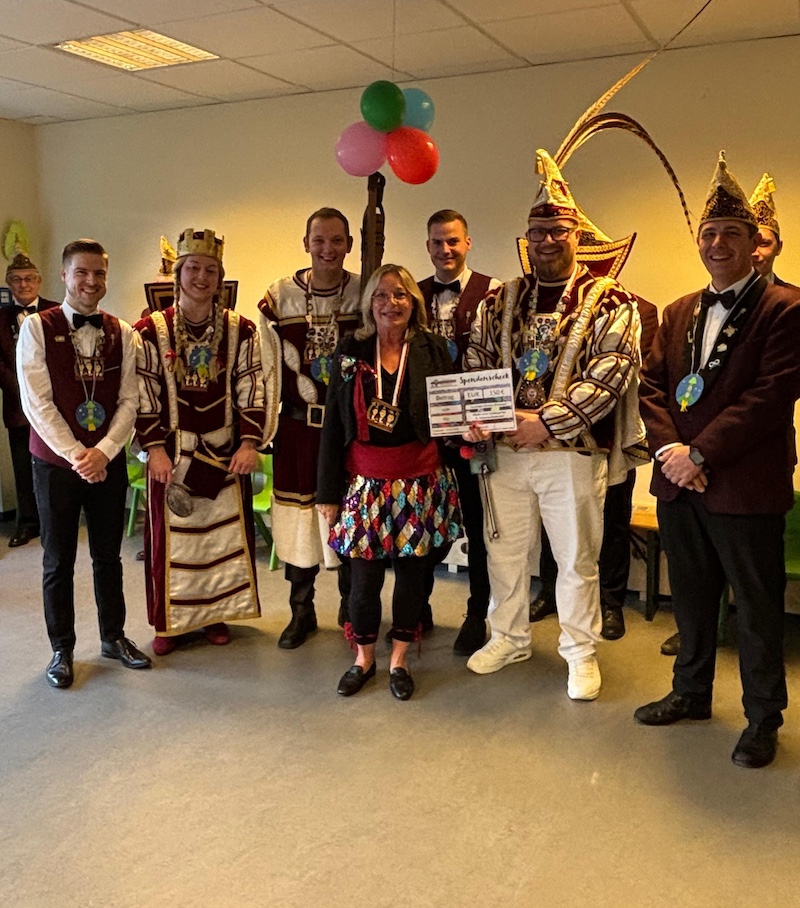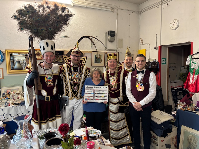Zweck ihres Besuchs war eine Übergabe der ganz besonderen Art. Die Kleischötte veranstalten seit einigen Jahren eine Sammlung zu Nikolaus. Neben einer schönen Nikolausfeier bekommen die Kinder vor Ort einen Weckmann, der Großteil des Geldes allerdings wird – ganz nach dem Vorbild des Heiligen Nikolaus - immer am Karnevalsfreitag an eine Organisation gespendet, die sich um bedürftige Kinder kümmert. In diesem Jahr wurde der Missionskreis Osteuropa mit einer großzügigen Geldspende überrascht. Unter einem Vorwand wurde die Leiterin des Missionskreises Leni Beyers am Freitagmorgen zum Feuerwehrhaus, das dem Missionskreis als Flohmarkthalle dient, gelockt. Leni Beyers staunte nicht schlecht, als die Kleischötte einzogen und Präsident Tobias ihr einen symbolischen Scheck über 700 € überreichte. „Das Geld kommt den Ärmsten der Armen zugute, die von unseren Partnern in Piatra Neamt betreut werden“, so die sichtlich bewegte Leni Beyers. Neben einem Kindergarten und einer Armenküche unterstützt der Missionskreis ein Mutter-Kind-Projekt, in dem Mütter mit ihren Kindern Unterkunft und Ausbildung ermöglicht wird. „Jeder Euro kommt unmittelbar den Kindern in Rumänien zugute“ kann Leni Beyers garantieren. Sofort wurde der Scheck am Eingang aufgehängt und bereits am Tag danach den zahlreichen Besuchern des Flohmarkts stolz präsentiert.