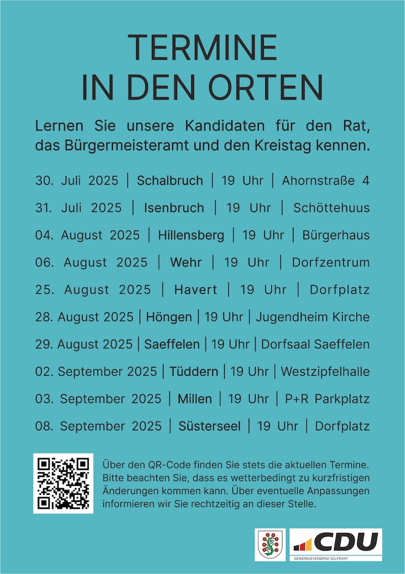 Bitte beachten Sie, dass es wetterbedingt zu kurzfristigen Änderungen kommen kann. Über eventuelle Anpassungen informieren wir Sie rechtzeitig über unsere Homepage www.cdu-selfkant.de oder bei Instagram/Facebook.