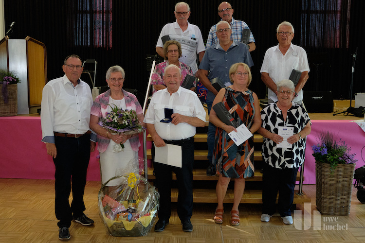 unten von links nach rechts. 1.Vorsitzende Franz Lipperts, Katharina Königs, Jubilar Josef Robertz, Astrid Klaßen, Eveliene Philippen, mittlere Reihe von links nach rechts: Annemie Zillgens, Rudi Krümmel, Peter, Jansen, obere Reihe von links nach rechts: Günter Zillgens, Kurt Cremers,