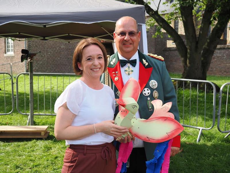 Weiter ging es mit dem Bürgervogel, an den sich diesmal 7 Bürger wagten. Fünfmal neigte sich der Vogel, bevor er beim 69 Schuss viel. Neue Bürgerkönigin wurde Rita Schmitz.