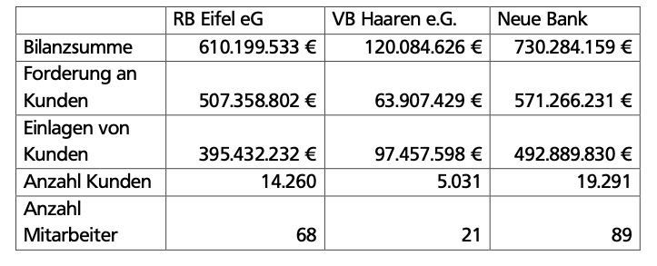 Beide Genossenschaften sind solide aufgestellt und in ihrem Geschäftsgebiet erfolgreich. Den Menschen und Unternehmen sind sie in ihrer Region ein zuverlässiger und kompetenter Partner sowie ihren Mitarbeiterinnen und Mitarbeitern ein guter Arbeitgeber. Die Geschäftspolitik beider Häuser ist nahezu identisch und die Strukturen beider Häuser ergänzen sich sehr gut. Zwischen beiden Banken besteht eine enge Verbindung und eine vertrauensvolle, partnerschaftliche Beziehung – all das ist eine sehr gute Ausgangsbasis für eine erfolgreiche Verschmelzung.