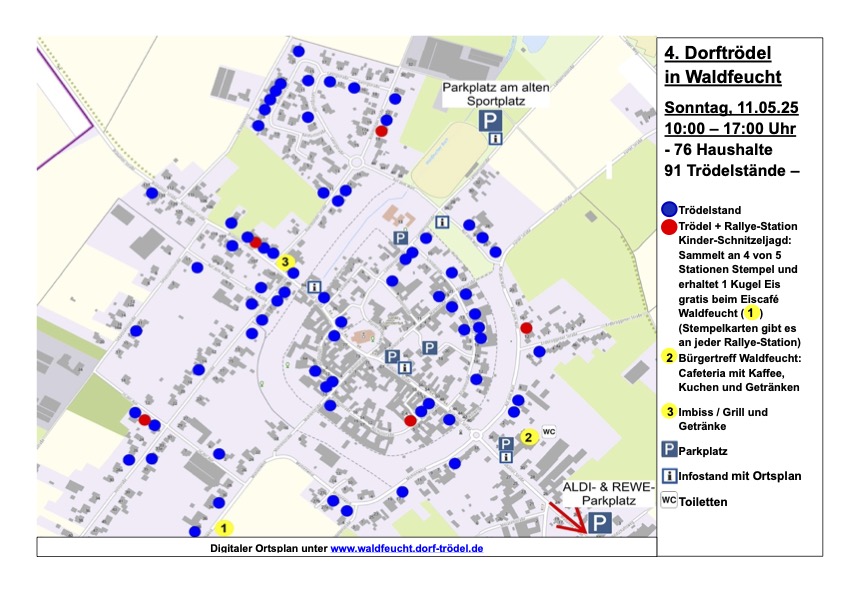 Es wird ein Ortsplan erstellt, wo die teilnehmenden Anbieter markiert werden. Dieser wird im ganzen Dorf an den Ständen verteilt und ausgelegt. Darüber hinaus gibt es auf der Homepage www.waldfeucht.dorf-trödel.de einen digitalen Ortsplan. Dieser dürfte die Navigation für die Besucher deutlich erleichtern.