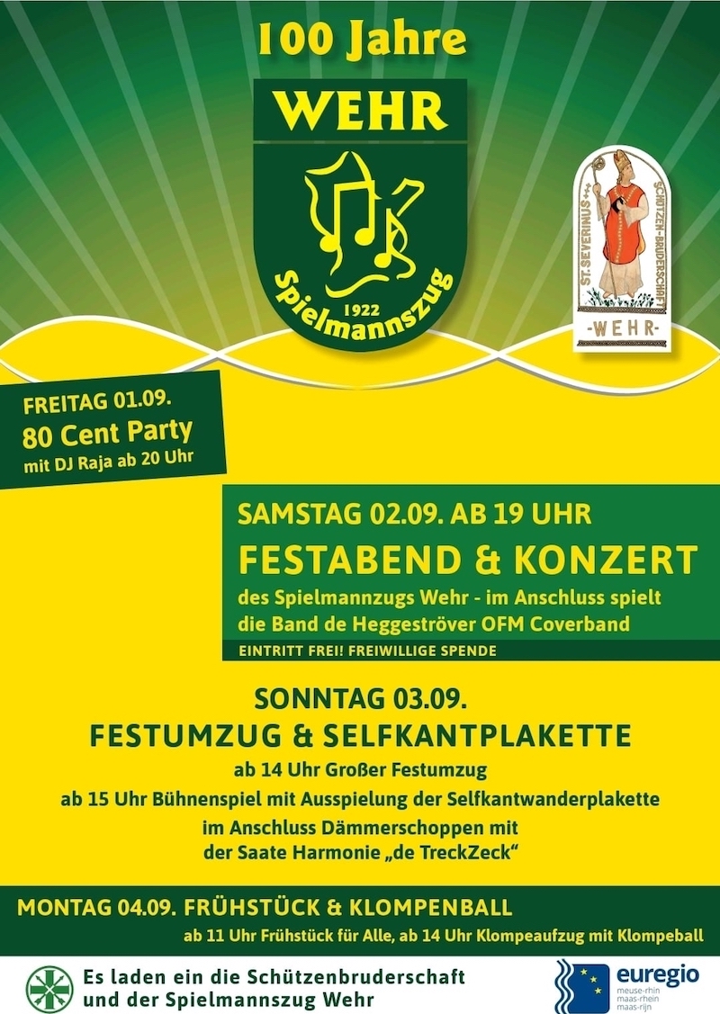 Am ersten Septemberwochenende feiert die St. Severinus Schützenbruderschaft Wehr traditionell ihre Kirmes. In diesem Jahr stehen die Kirmesfeierlichkeiten ganz im Zeichen der Musik, denn mit dem 100jährigen Jubiläum des Spielmannszuges Wehr und der Ausspielung der Selfkantwanderplakette stehen gleich zwei Highlights auf dem Programm.