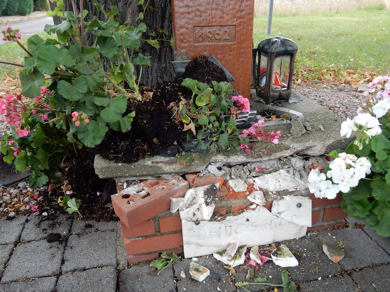 Durch die Sperrung der Waldfeuchter Straße wird die Friedhofsstraße derzeit stark frequentiert, auch von Schwerlastkraftfahrzeugen. Es ist zu vermuten, dass ein solches Fahrzeug das Kreuz gerammt hat. Das entschuldigt jedoch in keiner Weise das Verlassen des Ortes des Geschehens ohne Verantwortung für den entstandenen Schaden zu übernehmen.