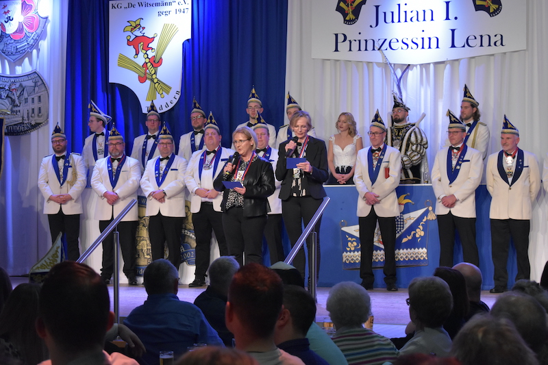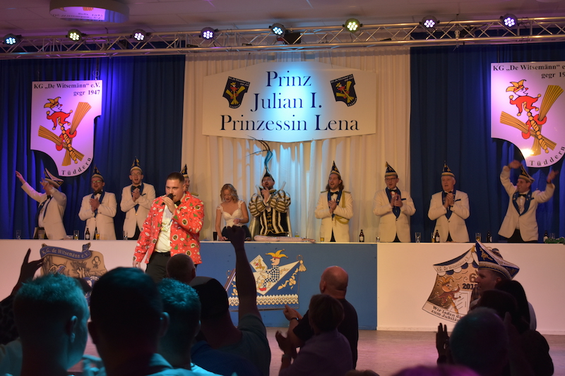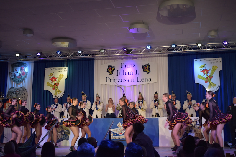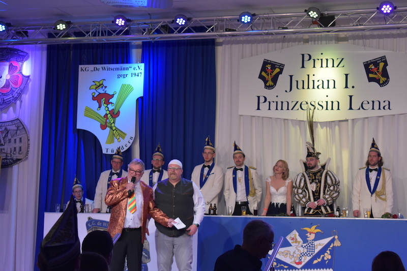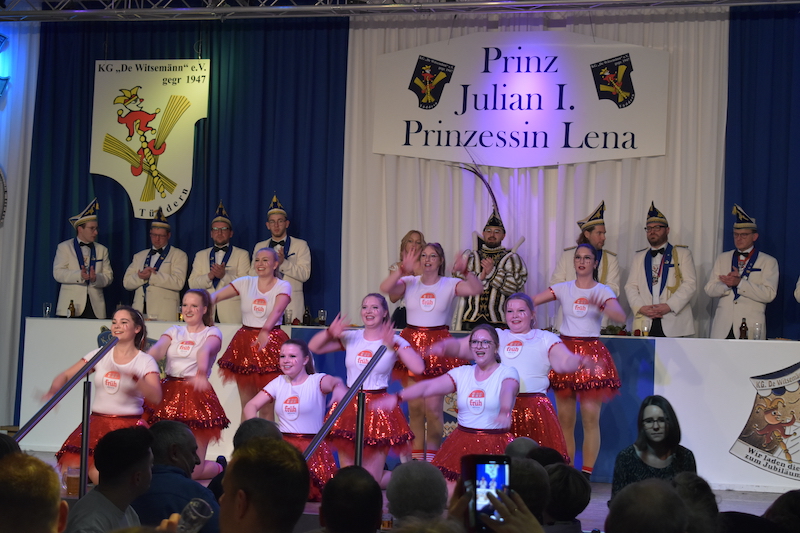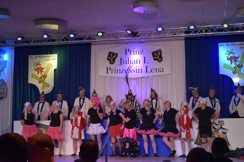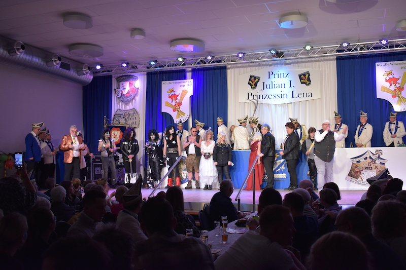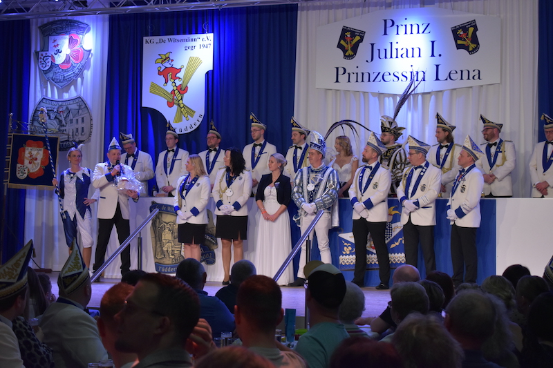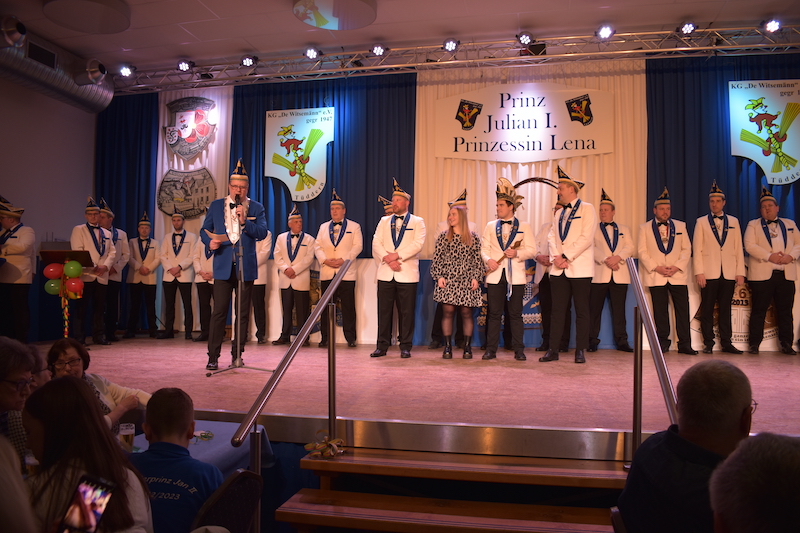 Am 06.01.2024 starteten die Witsemänn mit der Proklamationssitzung ihr Jubiläum, das unter dem Motto „Wir loate die Korke knalle – 7x11 Jahre KG De Witsemänn“ steht. Das sechsstündige Programm begann mit der Verabschiedung der Tollitäten der Session 2022/2023, Prinz Pascal I. und Prinzessin Vera mit ihren Adjutanten Florian Honings und Chris Heinrichs. Danach war die Bühne frei für das neue Prinzenpaar der Witsemänn, Prinz Julian I. und Prinzessin Lena mit ihren Adjutanten Thorsten Knarren, Simon Levers und Stefan Meufels. Sie wurden von ihren Freunden mit einem besonderen Auftritt auf die Bühne begleitet.