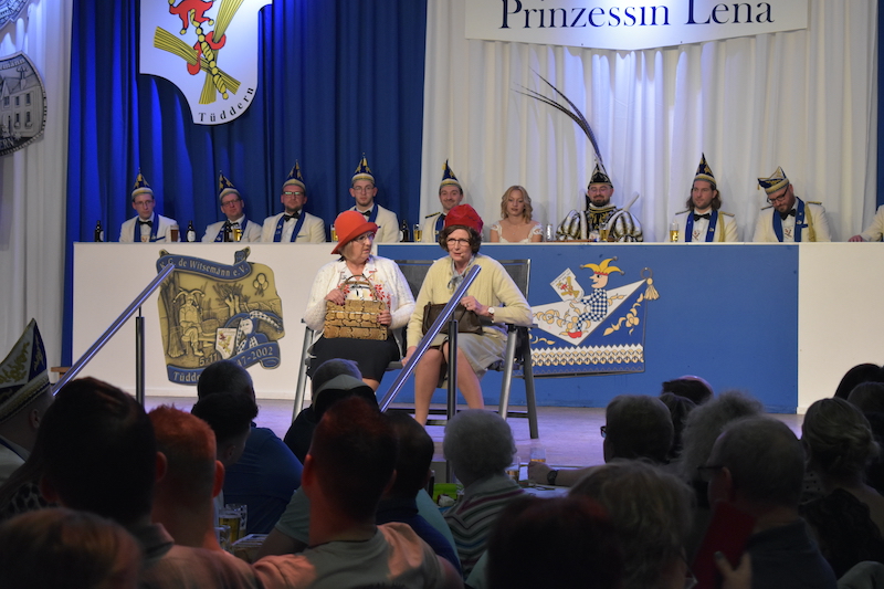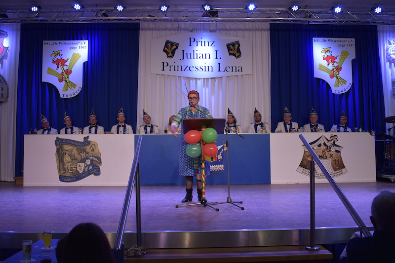 Anschließend wurde ein Programm der Spitzenklasse präsentiert, bei dem „Et Eigengewächs“ Anne Schlömer und Schola Kelleners wieder einen lustigen Sketch präsentierten. Zum Jubiläum konnten sich die Karnevalisten nochmals an einer erstklassigen Büttenrede von „De Marie“ Inne Hamacher erfreuen. Aus dem Kölner und Düsseldorfer Karneval erzeugten zwei rüstige Rentner „Willi und Ernst“ sowie „Oli der Köbes“ wahre Lachsalven beim Publikum.