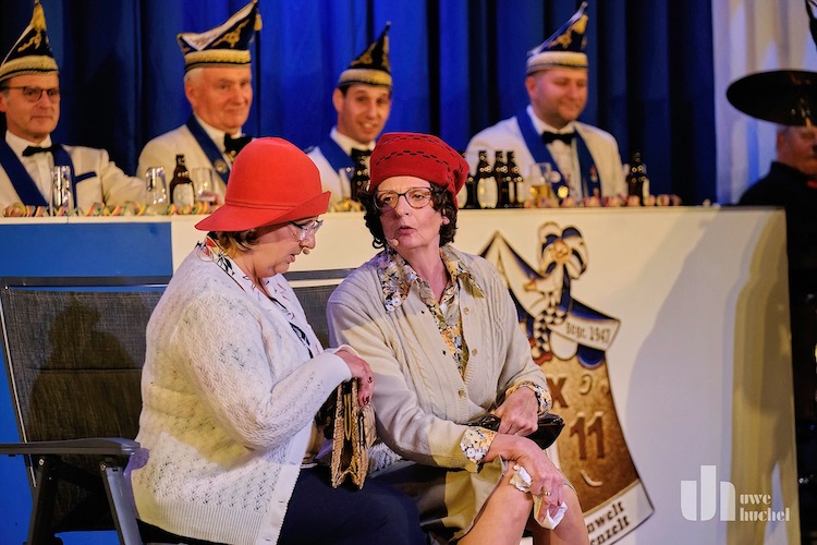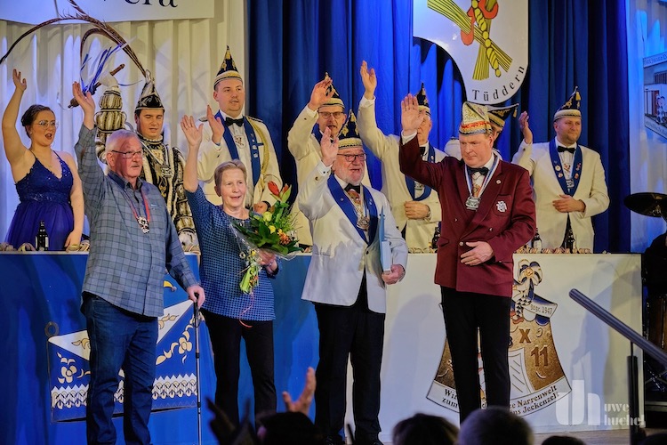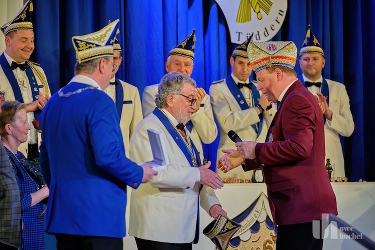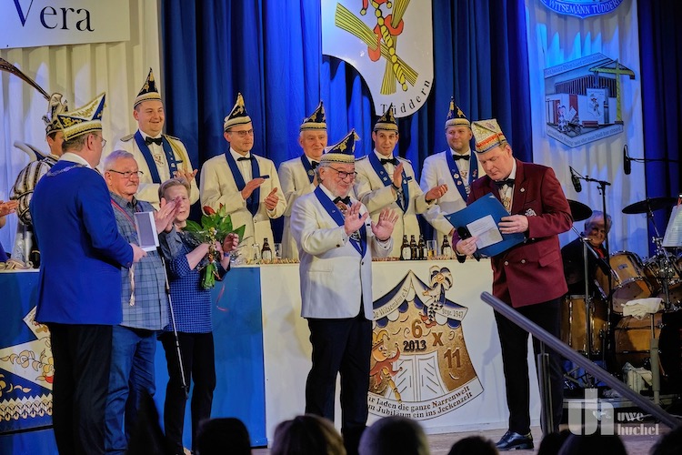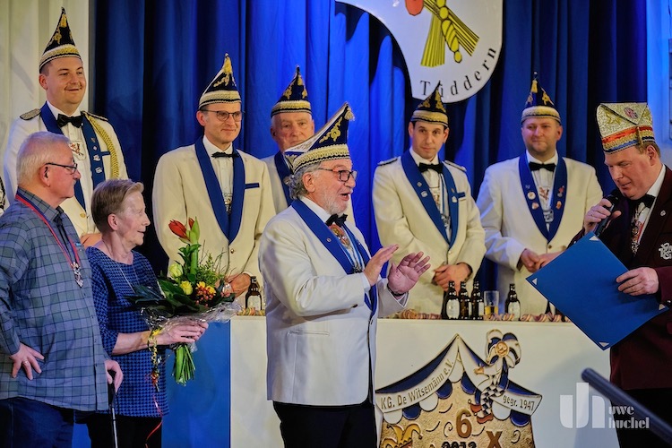 Ein besonderer Höhepunkt waren die zwei Ehrungen durch Herrn Jürgen Boix vom VKAG vorgegenommen. Franz Honings hat anlässlich seines silbernen Prinzenjubiläums das Grenzlandwappen verliehen bekommen. Köb Paulzen erhielt anlässlich seines goldenen Prinzenjubiläums, was eigentlich 2021 gefeiert werden sollte, den höchsten Verdienstorden des Bundes Deutscher Karneval in Gold mit Brillanten. Köb war im Jahr 1971 Prinz der KG „De Witsemänn“ und von 1973 bis 2006 ihr Präsident und ist immer noch aktiv bei jeder Veranstaltung dabei.