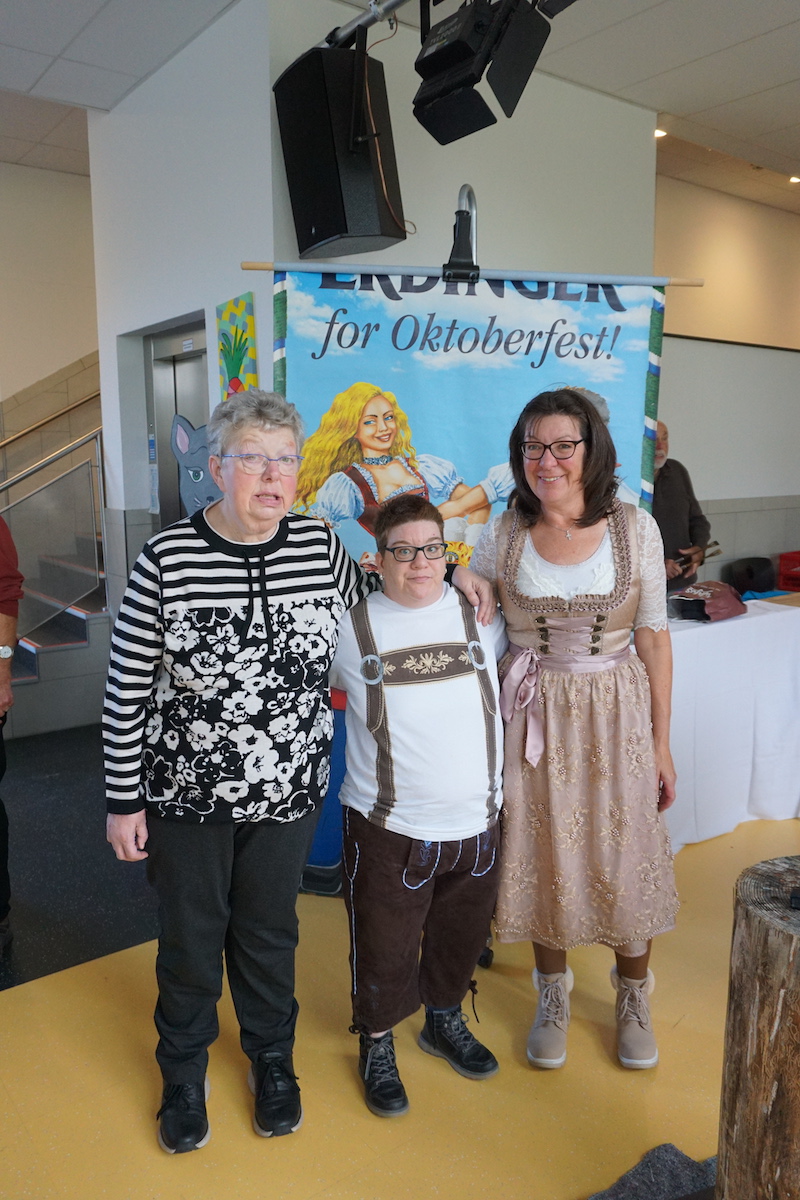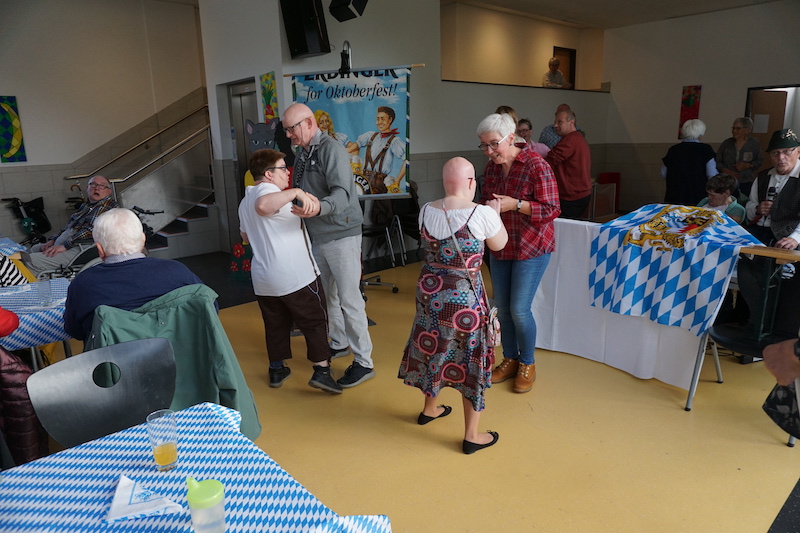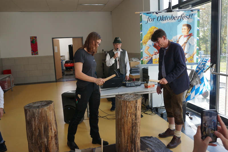 Der Förderverein für geistig-körperlich behinderte Menschen im Selfkant hatte seine Betreuungsgruppe mit ihren Angehörigen zu einem zünftigen Oktoberfest in die Selfkantschule nach Höngen eingeladen. Bereits am Vortag hatte der Vorstand die Mensa in eine weiß-blaue Festhalle verwandelt. Passend zum Oktoberfest erschienen einige Gäste sogar im Dirndl oder in Lederhosen. Das Vorstandsteam bewirtete die Gäste mit einer schmackhaften Kaffeetafel, damit man dann gut gestärkt die Kräfte im Nageleinschlagen messen konnte. Auf Einladung des Vorstands hatten Tischlermeister Frank Rombey und seine Auszubildende Jutta Claßen von "#TeamHandwerkHilft" große Baumstämme mitgebracht und extra Hämmer mit eingraviertem Schriftzug des Fördervereins angefertigt. Nachdem Bürgermeister Norbert Reyans den Wettbewerb mit einem ersten Duell eröffnet hatte, folgten viele spannende Zweikämpfe. Für die musikalische Unterhaltung sorgte DJ Heinz Ernst aus Süsterseel. Mit stimmungsvoller Musik lockte er viele Tänzer auf die Bühne. Dann stand das Dosenwerfen auf dem Programm, das bei allen beliebt ist, weil es nahezu barrierefrei ist. Zum Abschluss des bayerischen Nachmittags servierten Grillmeister Walter Cohnen und Hermann-Josef Backhaus dann noch leckere Spezialitäten vom Grill.