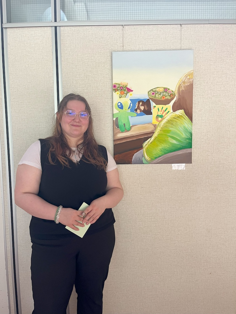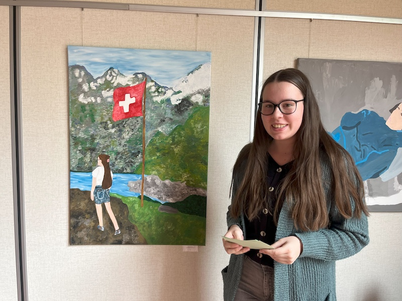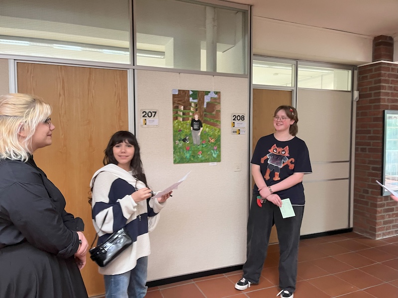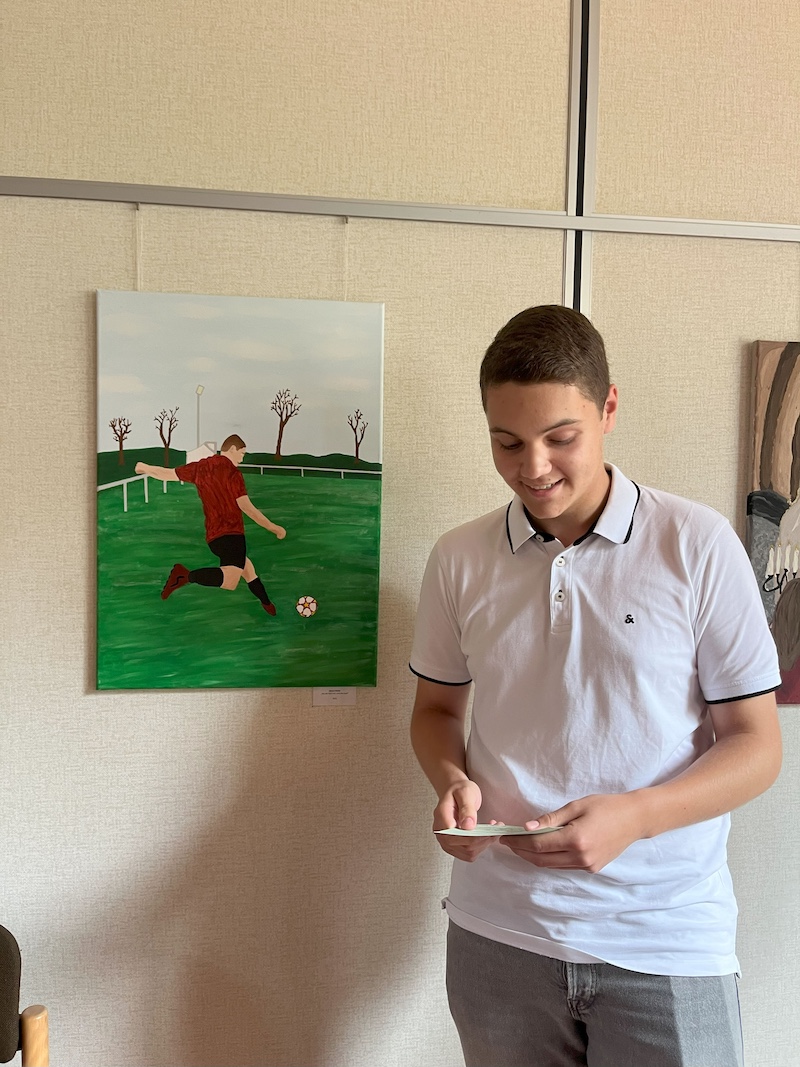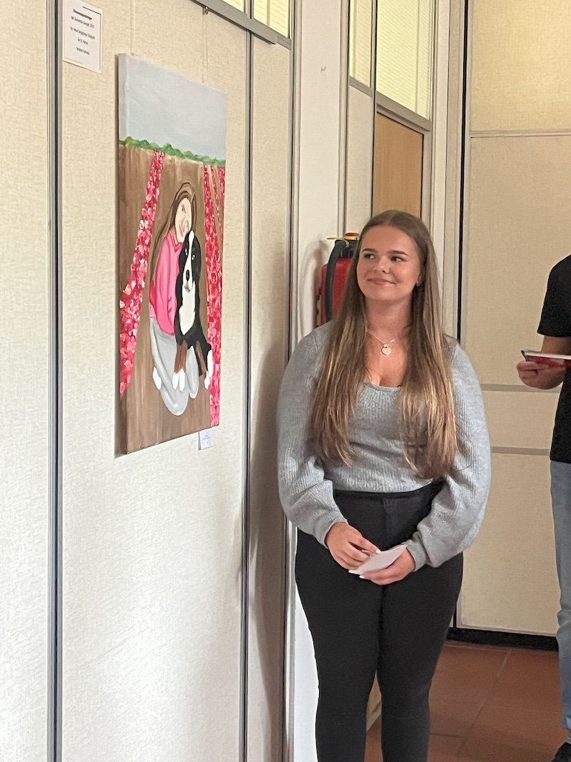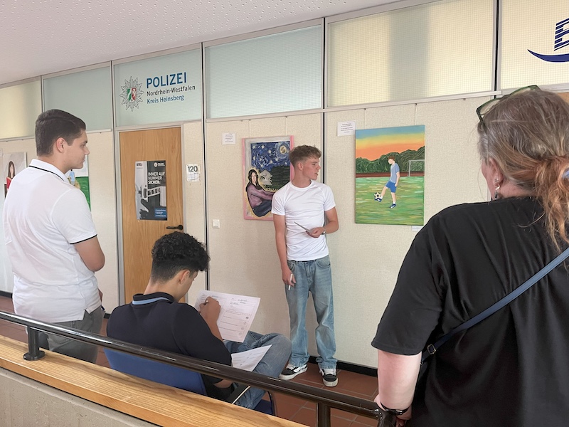 Im Anschluss an die Begrüßung und die Vorträge startete der dynamische und zugleich gemütliche Ausstellungsrundgang. In insgesamt sechs Präsentationsrunden stellten die Schülerinnen und Schüler ihre Werke vor. Die Künstler:innen präsentierten dabei nicht nur Titel und Thema ihrer Arbeiten, sondern gaben auch persönliche Einblicke in ihre Intentionen und den teils herausfordernden Entstehungsprozess.